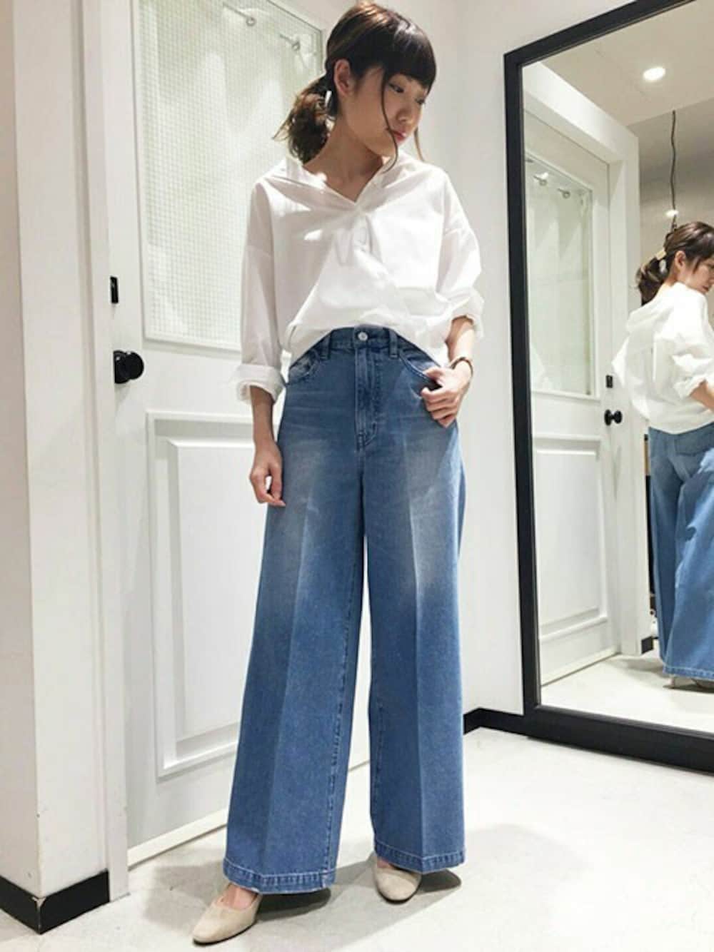 デニム×シャツのカジュアルコーデ。 シャツは抜け襟風に着こなし、センタープレスの入ったデニムを合わせてきれいめな雰囲気にまとめました。 足元はパンプスを合わせてスッキリとした雰囲気に♪