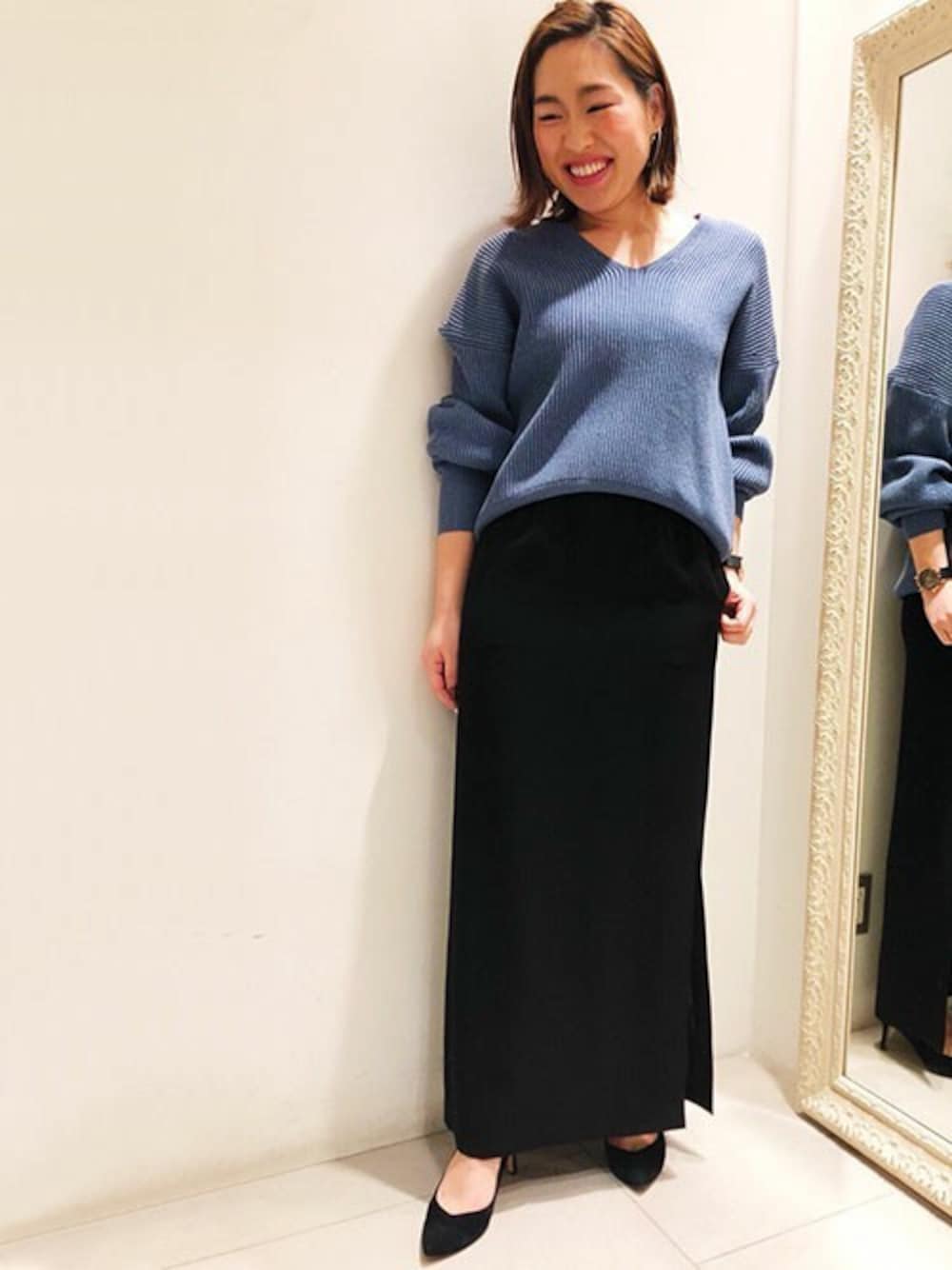 抜け襟ニット×タイトスカート ボトムはブラックで合わせ、トップスの色を引き立たせたのがポイントです♪
