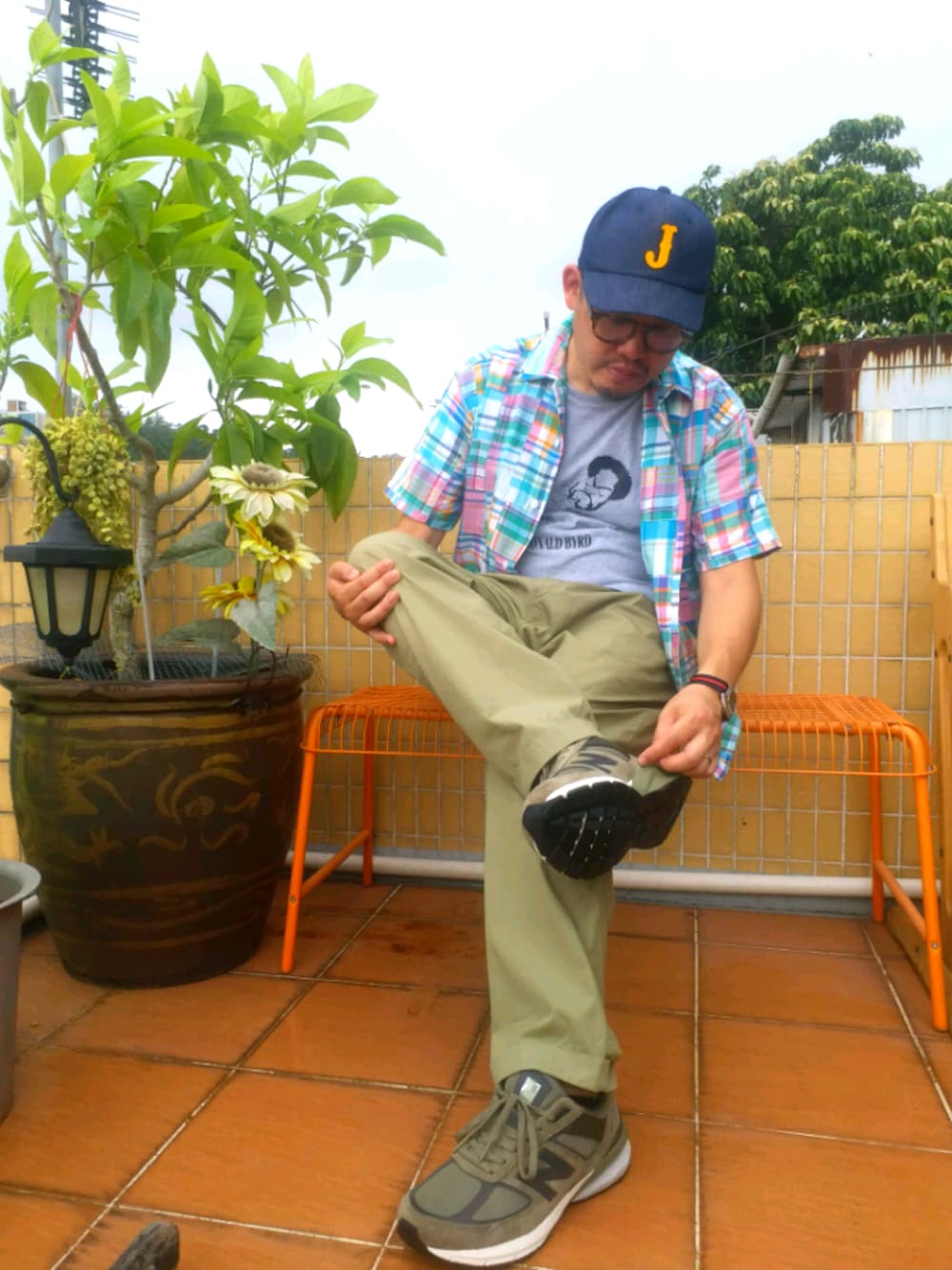 Shirt: Freak's Store Madras Pants: Italian army surplus T-shirt: Donald Byrd music T Footwear: New Balance NB990AE5 Cap: Japan Blue Jeans