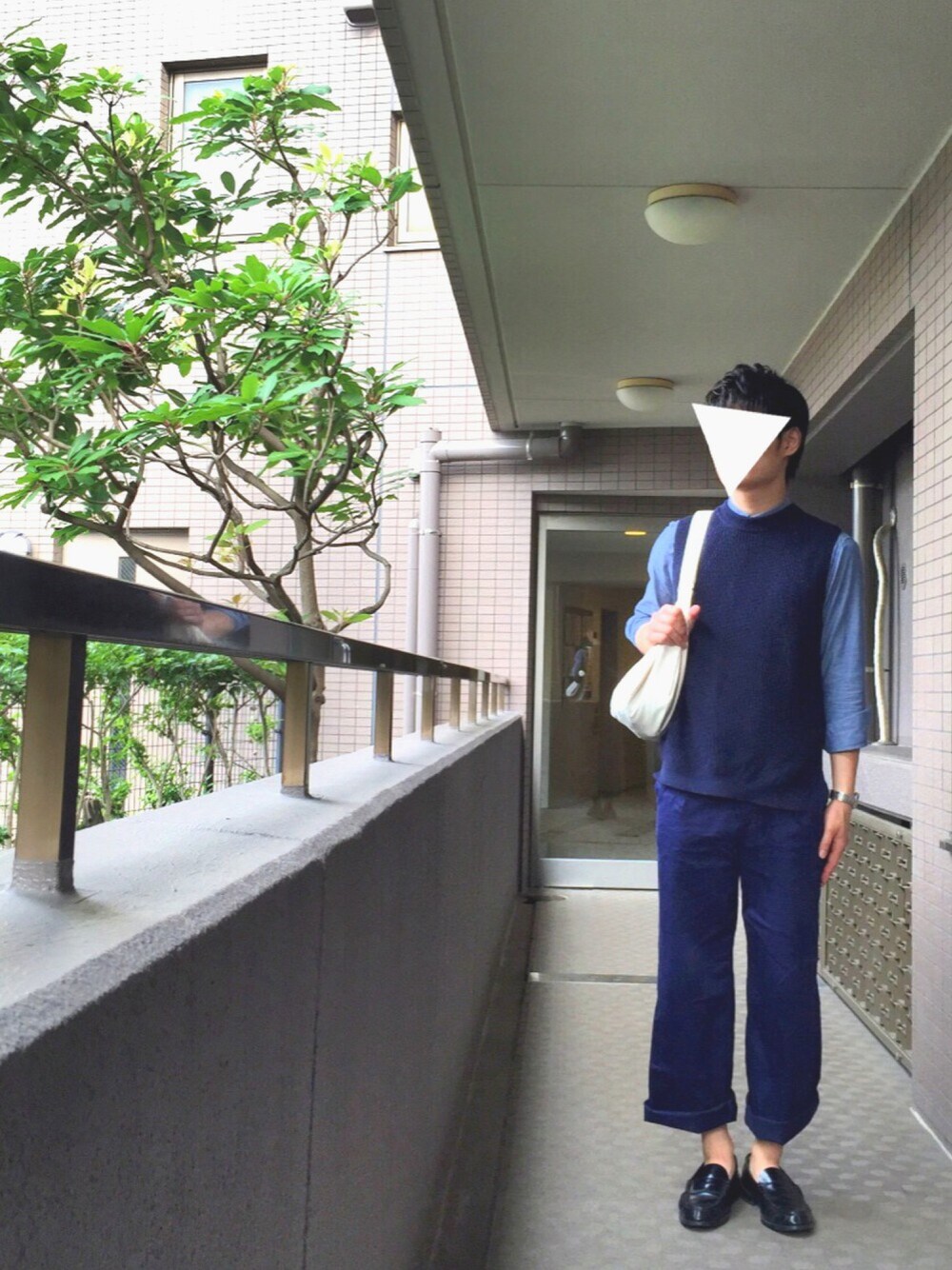 Tシャツにニットベストを合わせる奴を僕もやってみようと思ったのですが、サイズ感を間違えたのか予想以上にカマっぽくなったのでTシャツを諦めて間にシャツを挟んだところとても暑かった時のコーデです。
