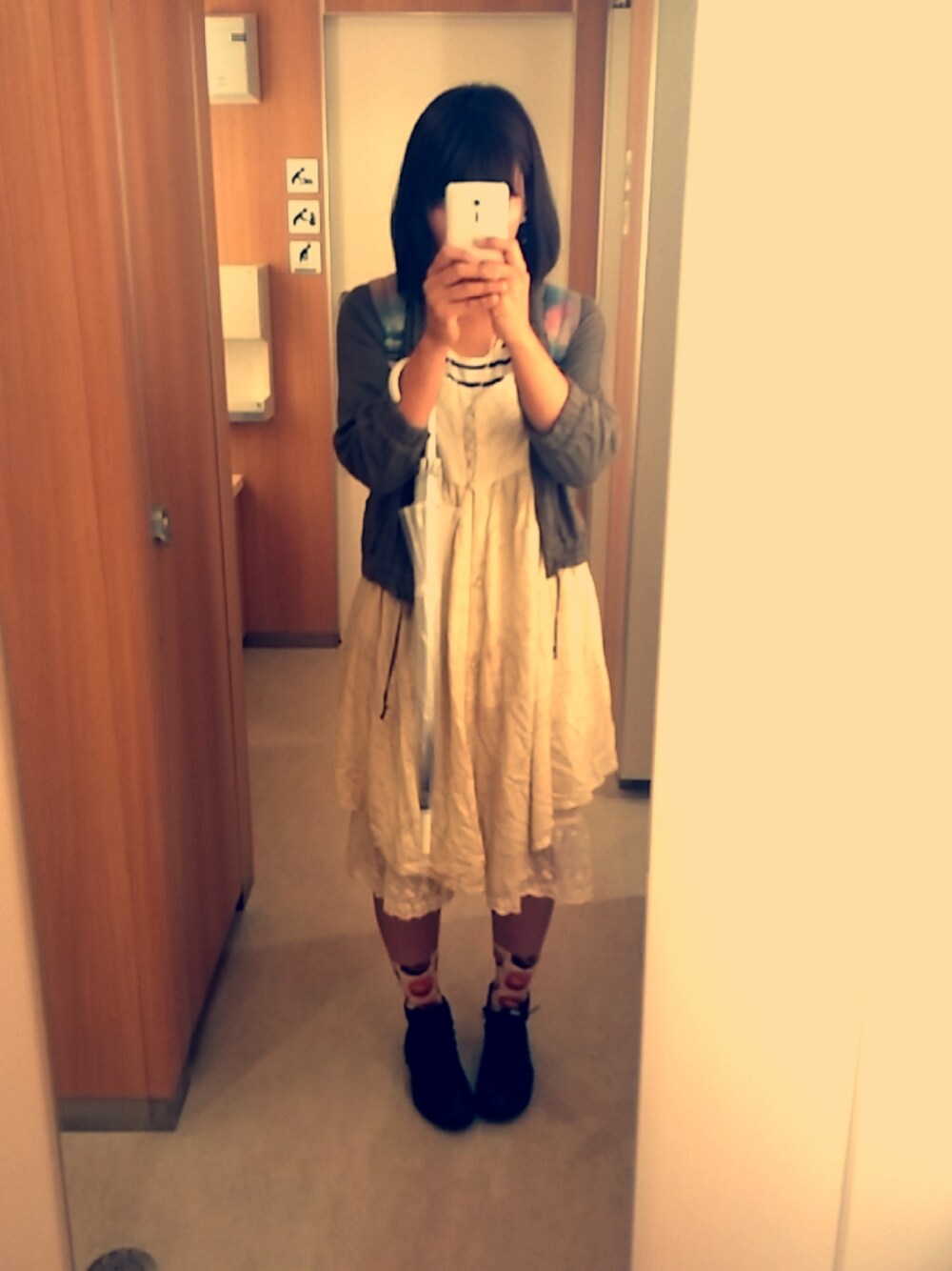 ホワイト系のワンピースを着用したレディースの秋コーディネートの1枚目の写真