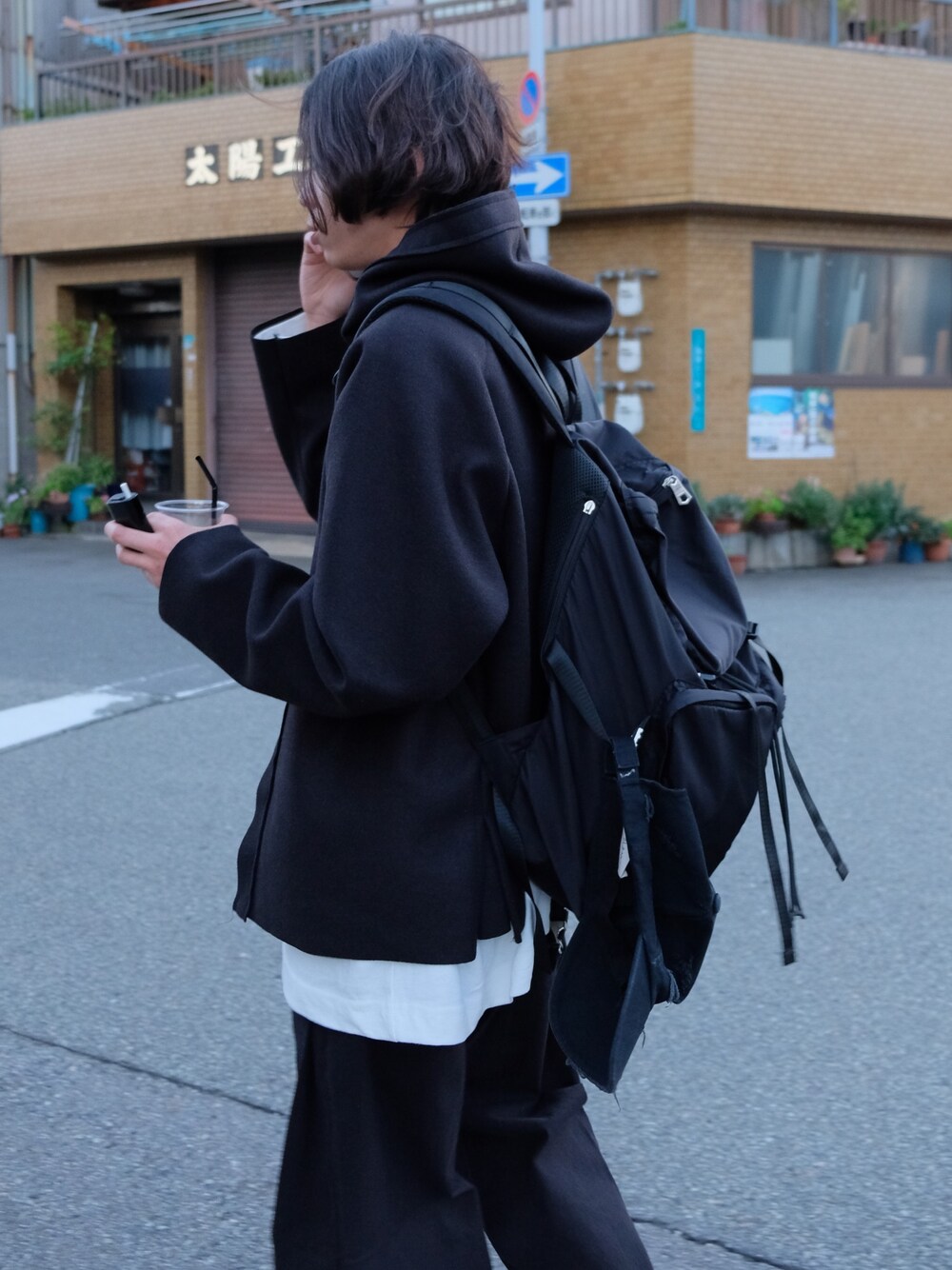 ブラック系のパーカー、ブラック系のその他パンツを着用したメンズの秋コーディネートの1枚目の写真