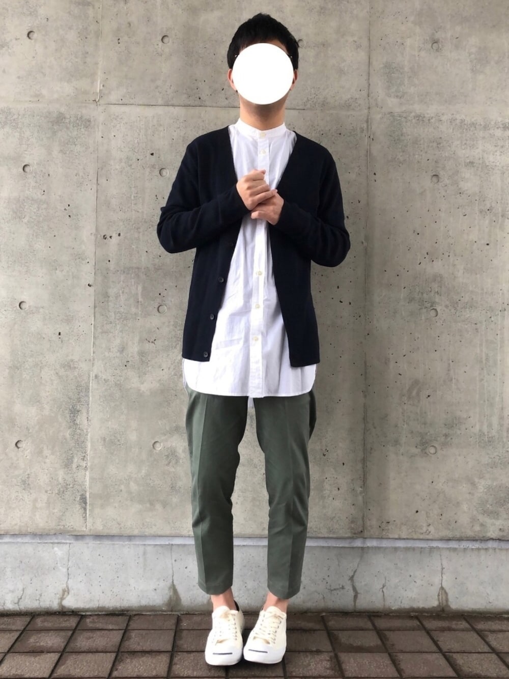 いつもご覧いただいてありがとうございます! スタンドカラーシャツがマイブームです。 白シャツ×ネイビーカーディガンと王道スタイルですが、「ロング丈」がプラスαになってますかね⁈