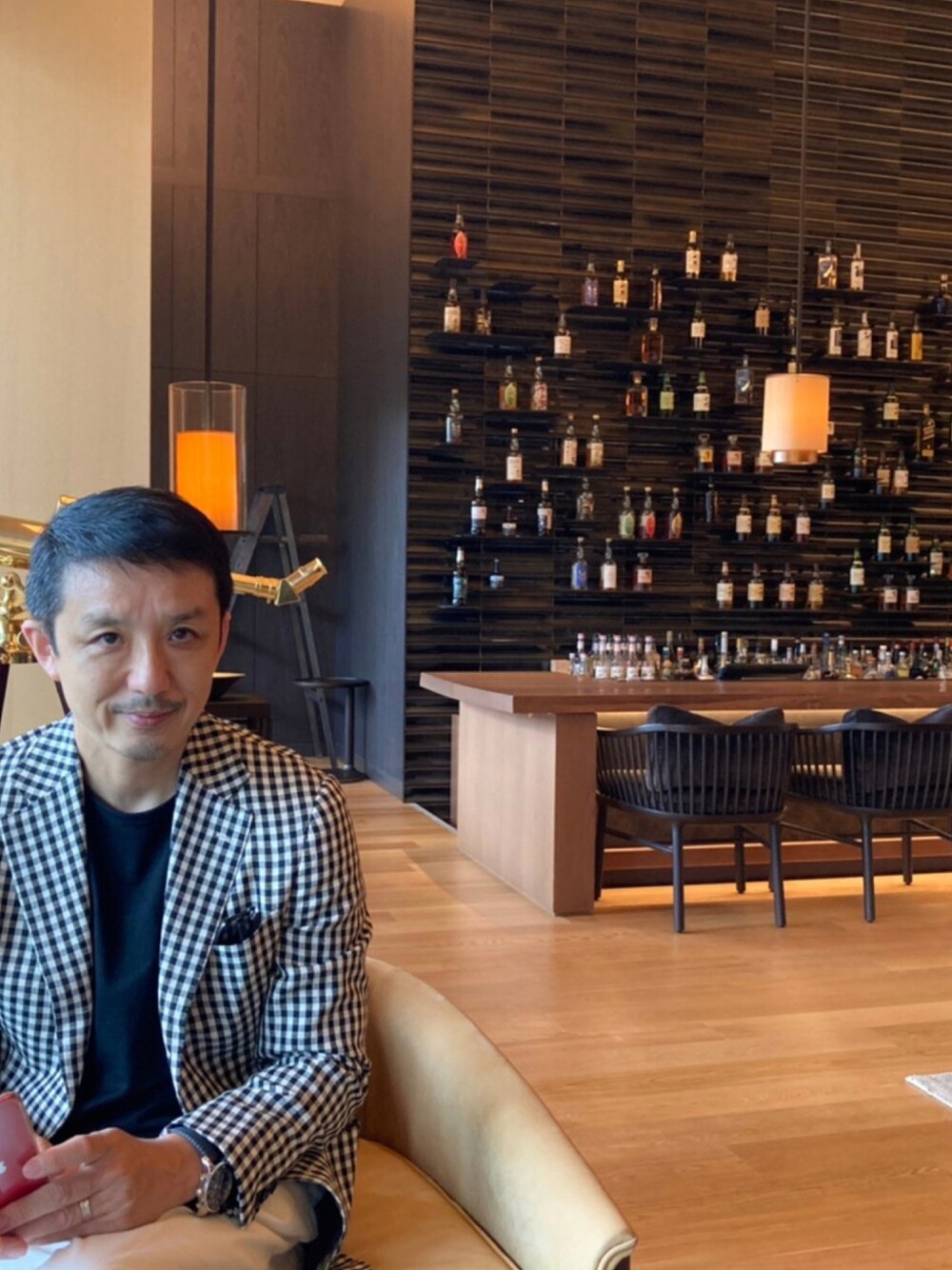 ホテルのラウンジ…素晴らしいホテル。黒のTシャツにジャケット。