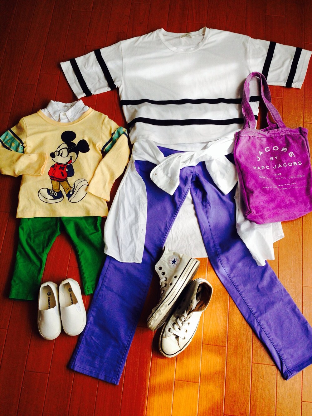 カラーパンツに合わせるなら春はやっぱり 白多めで爽やかにね^_^ 今年はお花見するぞ。 (mama) カラーパンツ/UNIQLO ボーダーカットソー/セレクトショップにて 白シャツ/NIMES バック/MARC JACOBS シューズ/コンバース ハイカット (kids) カットソー/ライトオン 白シャツ/不明 カラーパンツ/seraph シューズ/ヒラキ