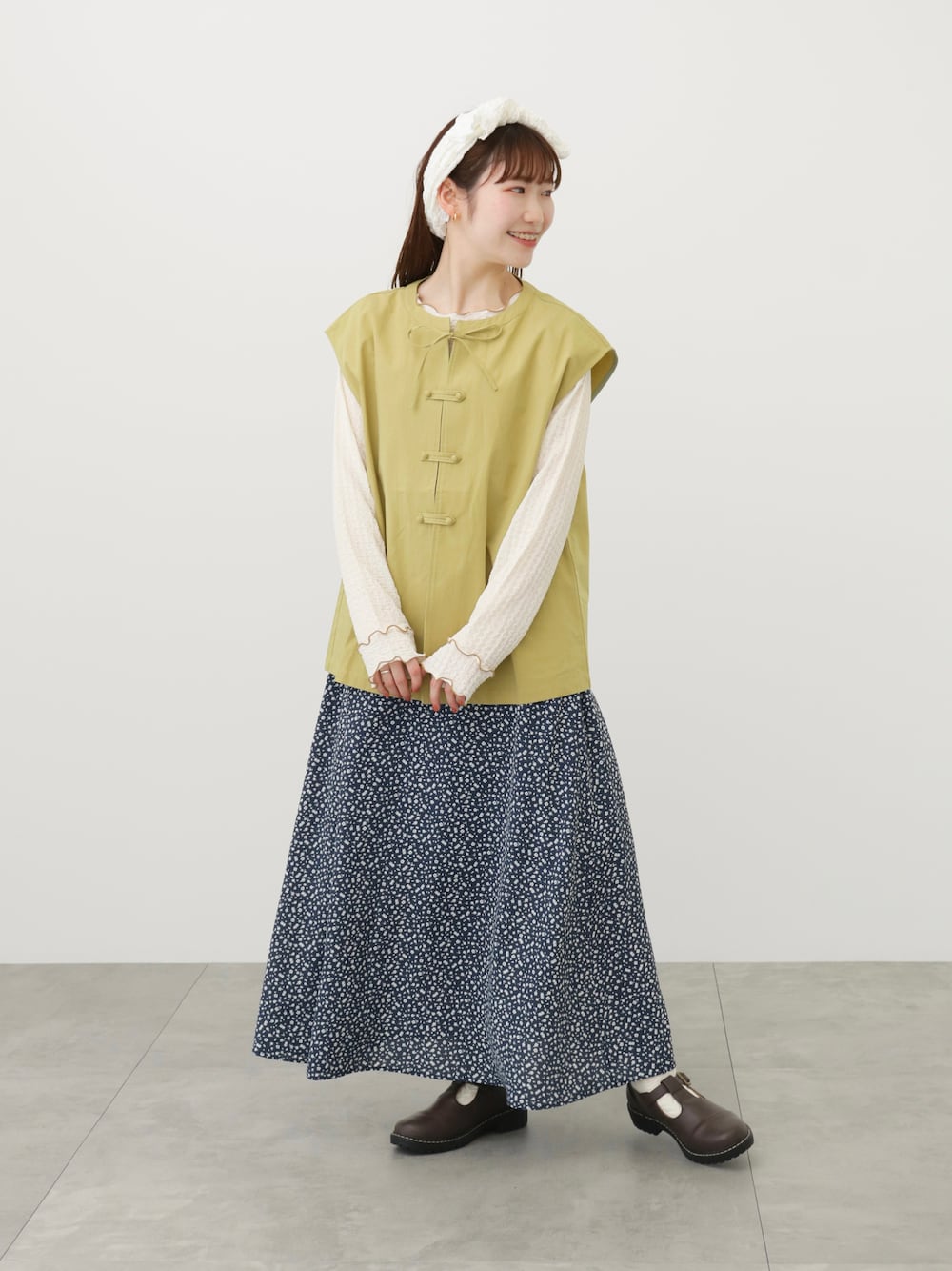 ベストのカラーが春らしくてテンションが上がりました☺︎ スカートはボリュームが出過ぎない素材感なので、 ゆるっとしたサイズ感のトップスとの合わせもおすすめです◎