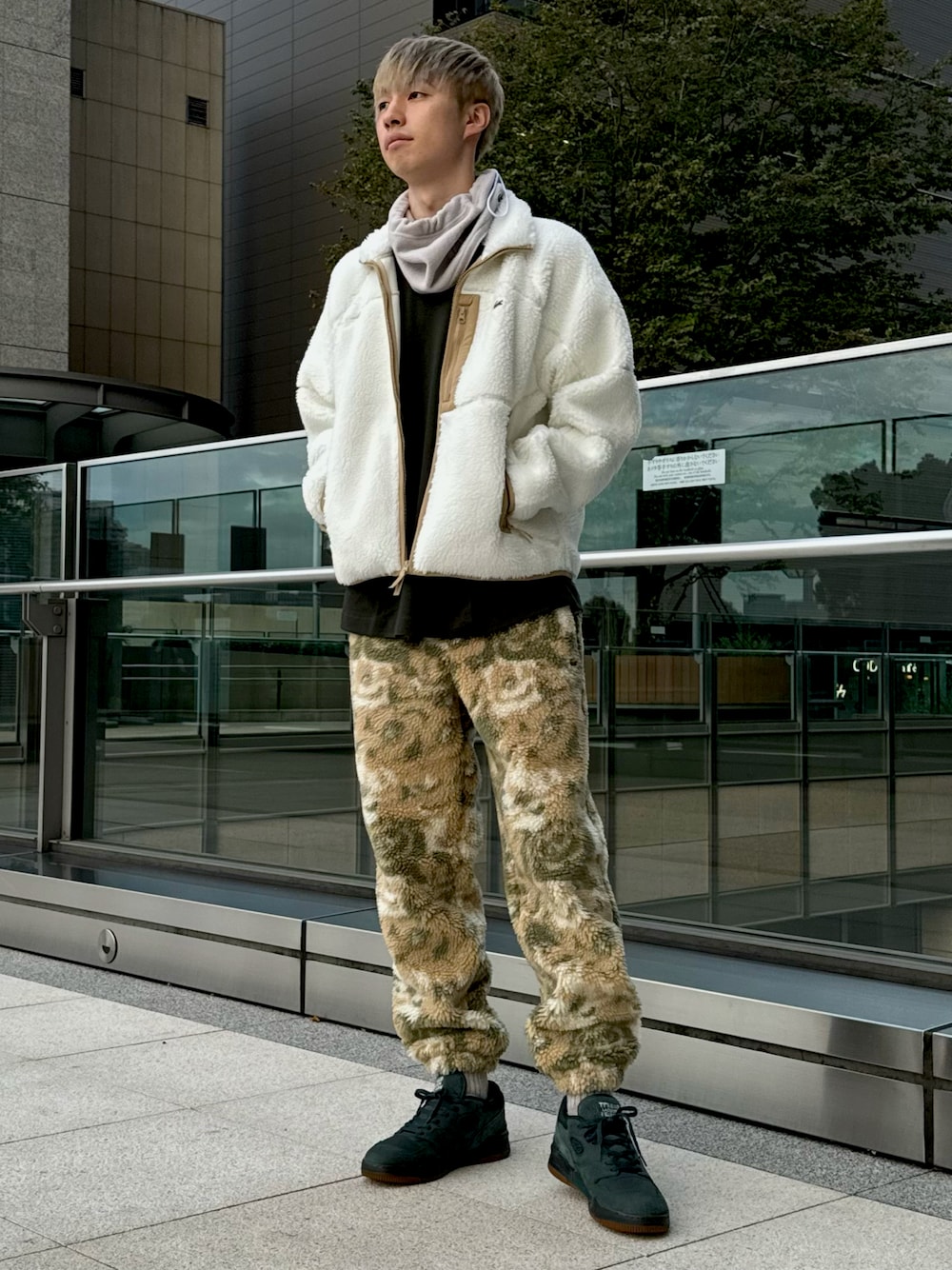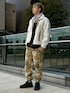 ボアの冬感を楽しめるコーデです! シンプルなカラーリングのアウターが、華やかで存在感のある迷彩風のボトムの柄感をより引き立たせてくれます。非常に冬らしくも色を感じられます!