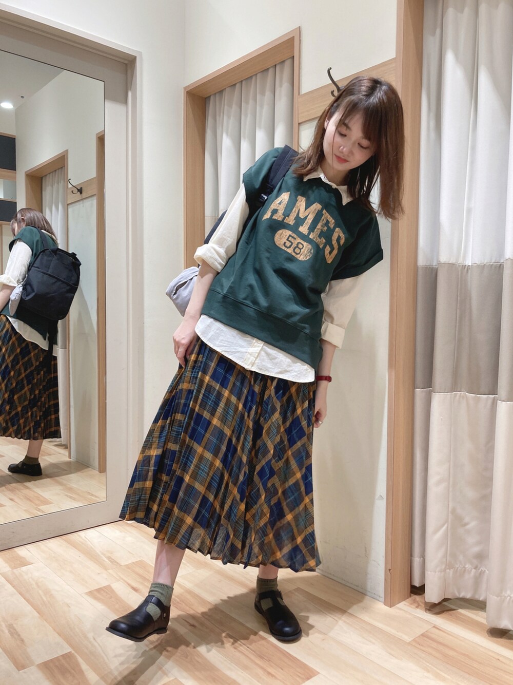 ご覧いただきありがとうございます🌷 今回はベストにチェックスカートでスクール風のコーデです🎓 ベストは後ろのスリットがかわいいです◎ ぜひ店頭でご覧ください👀✨