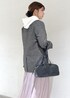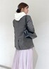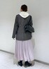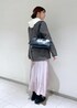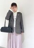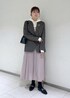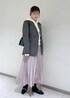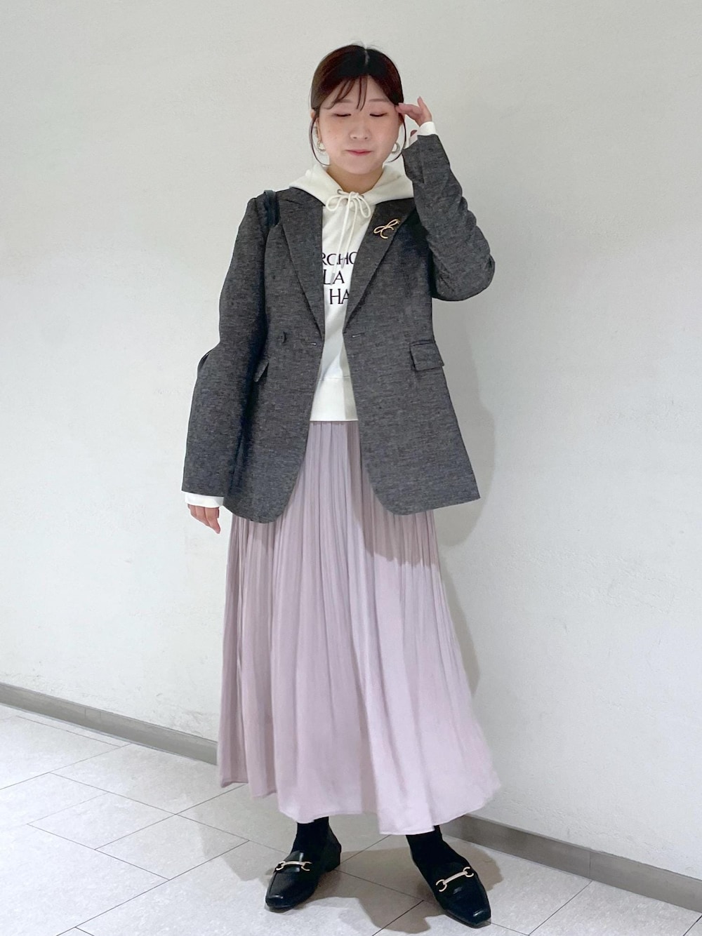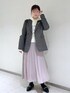 トップスが重ためのスタイリングなので スカートは軽めのプリーツスカートでバランスを取りました。 髪の毛はまとめてアップスタイルが◎ アウター感覚で着用できるジャケットなので先も長く使っていただけます。