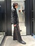ベロアのシャツとデニムのモードカジュアルコーデ ポイント シャツはベロア素材で上品な着こなしに向いています! 全面に柄も入っているので一枚で着ても様になるデザインです! パンツはZIPの開け具合によってフレアにもワイドフレアにもストレートにもすることができます! これ1本でいろんなシルエットを楽しめる万能パンツです