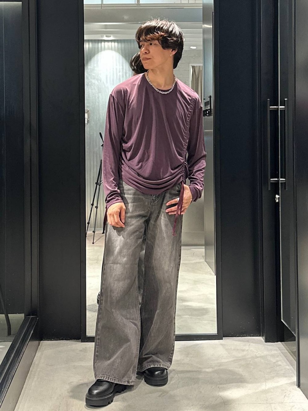 ギャザーのカットソーでシルエットに変化をつけたカジュアルコーデ ポイント トップスにはギャザーのデザインが施されており自身で調節可能なのもポイント! 左右非対称にギャザーが入っているのでより独特なシルエットで他と差別化することができます!