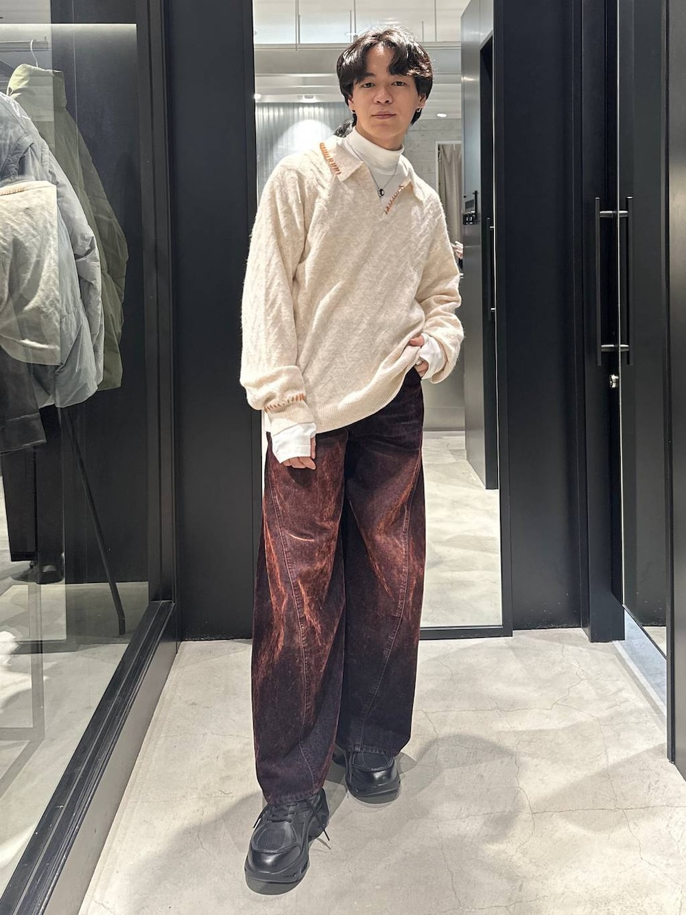 ポロニット✖️ハイネックの綺麗めカジュアルコーデ ニットはウールを25%使用しており柔らかい肌触りと生地の質感がハレらしい綺麗めなコーディネートに冬らしさを演出します! ⚫︎立体感で魅せるワイドシルエットパンツ 立体裁断により膝下から裾にかけてボリュームが出るワイドシルエットで、履くだけで脚長効果を実現。コンパクトなトップスと合わせれば美しいAラインシルエットにしてくれます!