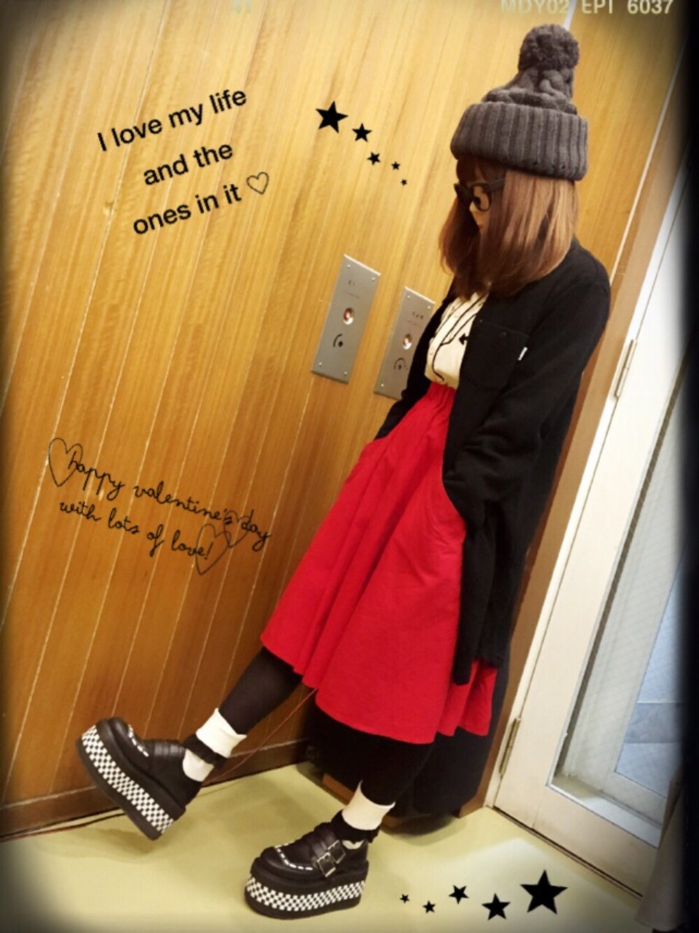 前髪をザックリ切ったので 新しいお洋服が着たくなりました(◍•ᴗ•◍)♫ ミモレ丈の赤いスカートに シャツをインして 今日のピックアップタグのフィットアンドフレアーバランスで⋈*。 そこにメンズのRUDIESのカーディガンをプラスすることで 自分らしく◡̈♥︎