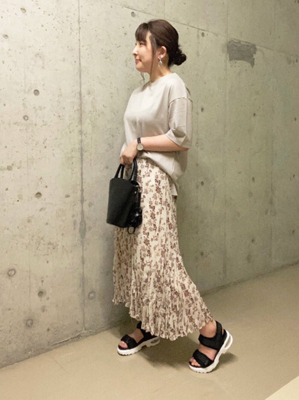 ゆるシルエットのGIZAコットンTシャツはサラサラとした肌触りで着心地抜群♪ 流れのあるプリーツスカートをあわせて女性らしい着こなしに♪