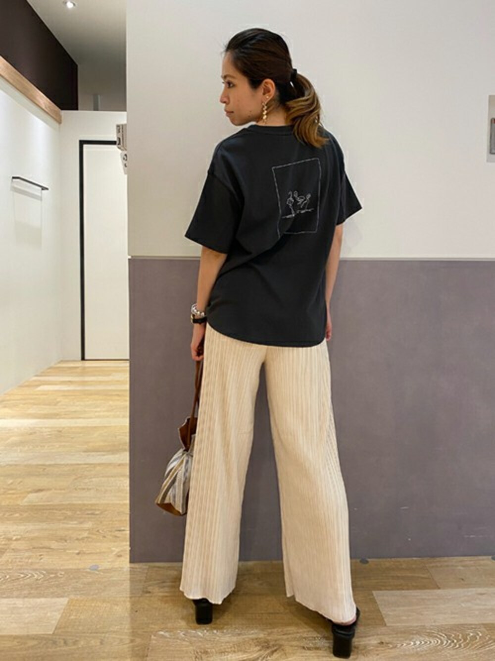 肌触りの良いシャツは、さりげないバックプリントがポイント。プリーツパンツと合わせてゆるさの中にトレンド感をプラス。