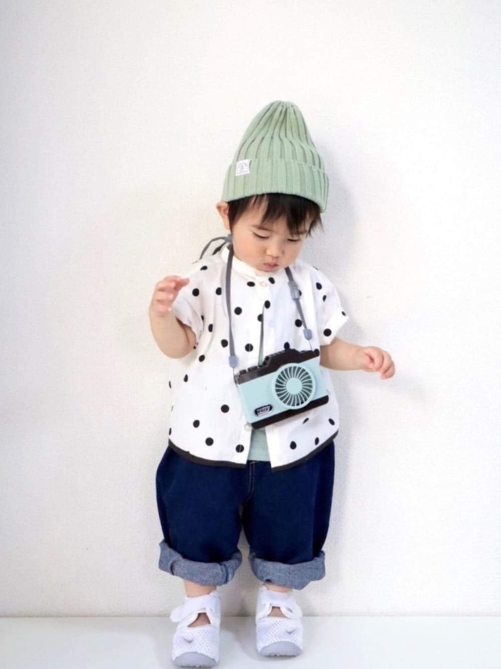 #ドット ドット大好き! デニムデカすぎる。 これでも履けるくらいの サイズになりました👏 サイズ90だが、やたらでかい。 シャツは上だけボタン閉めて、 下は中のミントグリーンタンクが チラチラするようにしました 午前中に頼んでたカメラ型扇風機届く。 おりつ氏食い付く。気に入る。 タンクのちらりにかぶる 扇風機にいいとこもってかれました なんなら色もかぶってるし ミントグリーンの扇風機かわいい コーデの小物にも使えていいです📷✨ タンクさんごめんね🙏 お散歩中は飴代わりにスルメを なめてました🦑