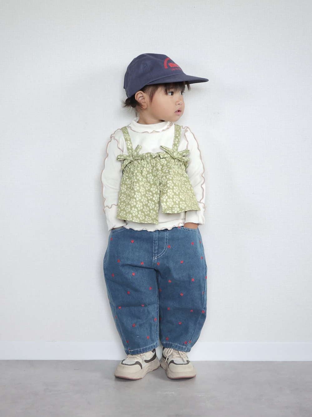 p.プルミエの服は まずはこれ🫶🏽 とりあえずなんかしら買うよね♡ あんまりカラフルすぎるやつは そんなに買ってないけど、 ついつい色々買っちゃう😮 ハートデニムにお花ビスチェ 本人もテンションあがってるよ~👶🏽♡♡