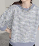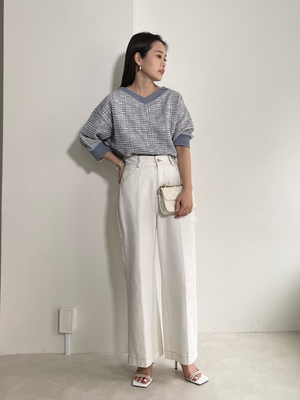 大人気のツイードニットソーに 白のペインターパンツを合わせたコーデ🌱 Vネックを前にしてタックインすることで すっきり着られます!