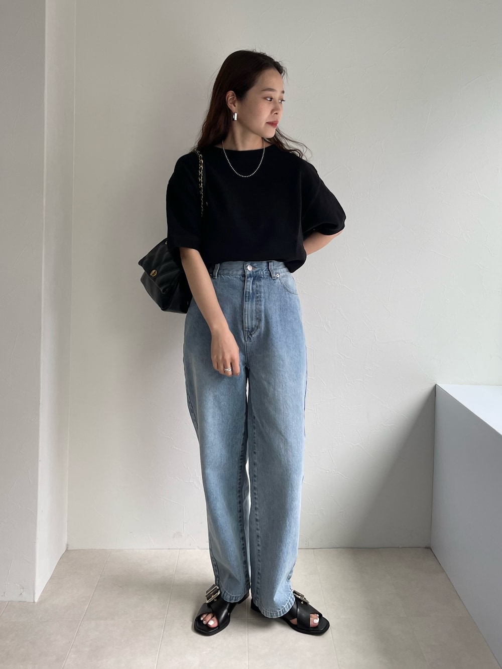人気のトップスを使った シンプルコーデ🌱 明るい色のデニムと合わせることで ブラックでも重たく見えずおすすめです!