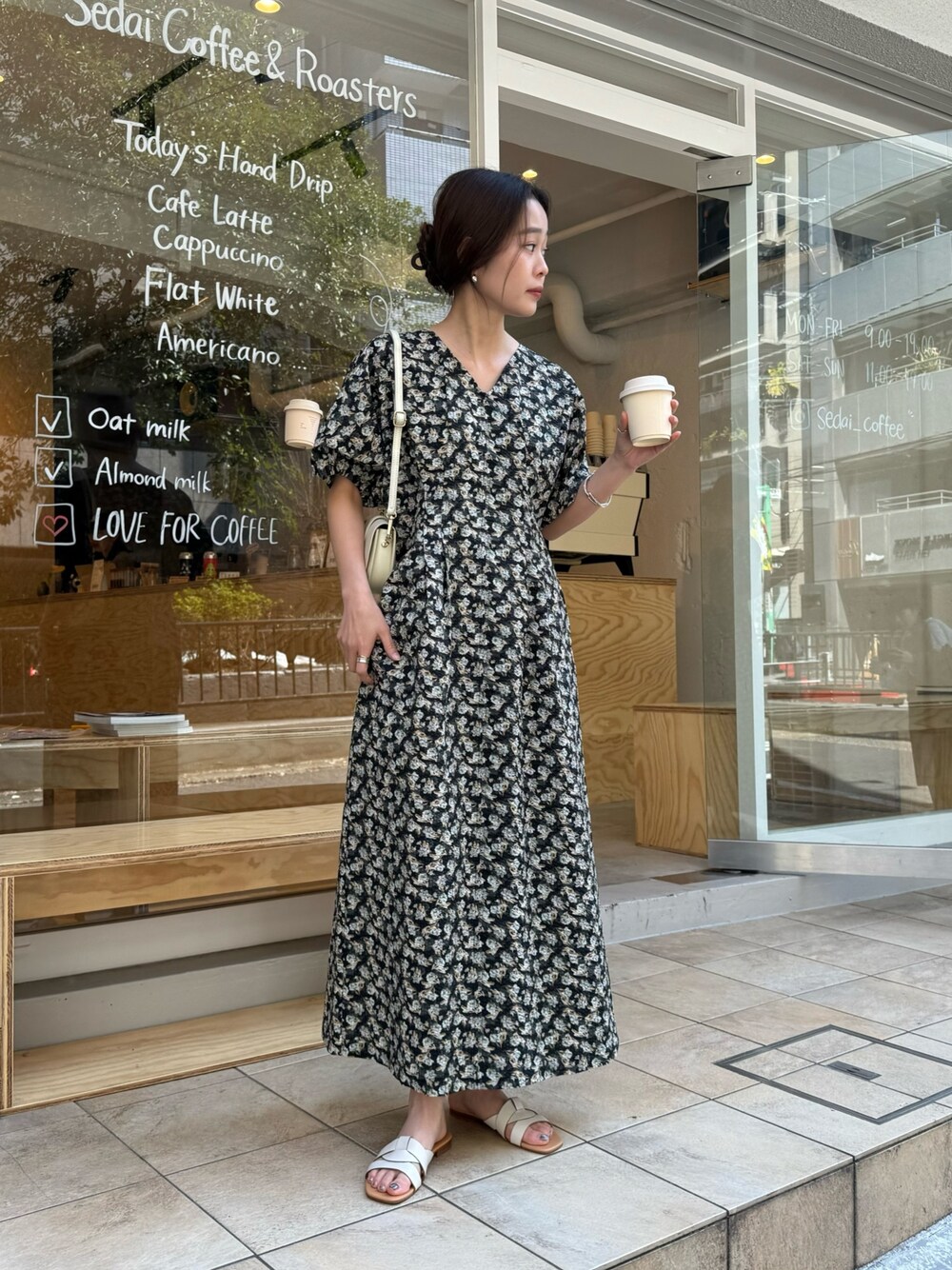 花柄ワンピースを大人かわいく◎ 程よくウエストがシェイプされたデザインで スタイルアップを叶えてくれるワンピです! ポコポコとした素材で なにより着心地がとても軽いのが 嬉しいポイント! かさばらず、シワも目立たないので 旅行などにもおすすめの一枚です♡ 身長160cm 38サイズを着用 足首にかかるくらいの丈感です。