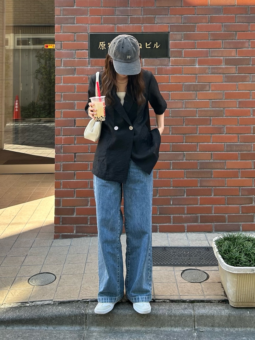 シアーの半袖ジャケットを使った カジュアルコーデ! 軽い着心地でサラッと羽織れるので 暑い日でも快適です! 模様がさりげなく入っているのも お気に入りポイント◎ デニムパンツは大人気のセミワイドデニム。 すっきりみえるセミワイドなので スタイルアップ効果も抜群です! 160cmの私は38サイズを着用しています。