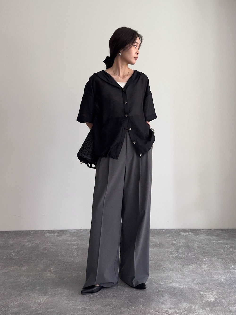 シアーフーディハーフスリーブシャツ →フード付きのシアーシャツは ゆったりとしていて抜け感のある印象◎ 幼くみえないよう、スラックスパンツを 合わせてみました! 接触冷感タックスラックスパンツ →落ち感のあるセミワイド! リラックスしつつもラフに見えすぎず、 履くだけで高見えコーデに✨ 肌に触れるとひんやり感じる接触冷感機能と 急な雨でも安心な速乾性、シワになりにくいのも 嬉しいポイントです!