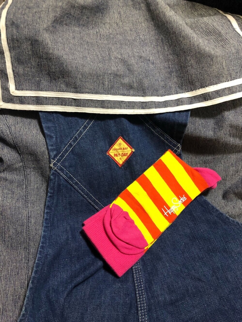 ご覧頂きありがとうございます。 出かける予定がキャンセルになったので、実際に着るのは少し先。残念。 オーバーオールとセーラーシャツのコーディネート。 オーバーオールはアメリカのストアブランドペニーズのペイデイ。1950年代頃のもの。 セーラーシャツは、先日も登場したフランス海軍風のもの。 ソックスは、ハッピーソックスの赤と黄色のボーダー。 オーバーオールの背中のマークと色合わせ。 こういうのが好きです。
