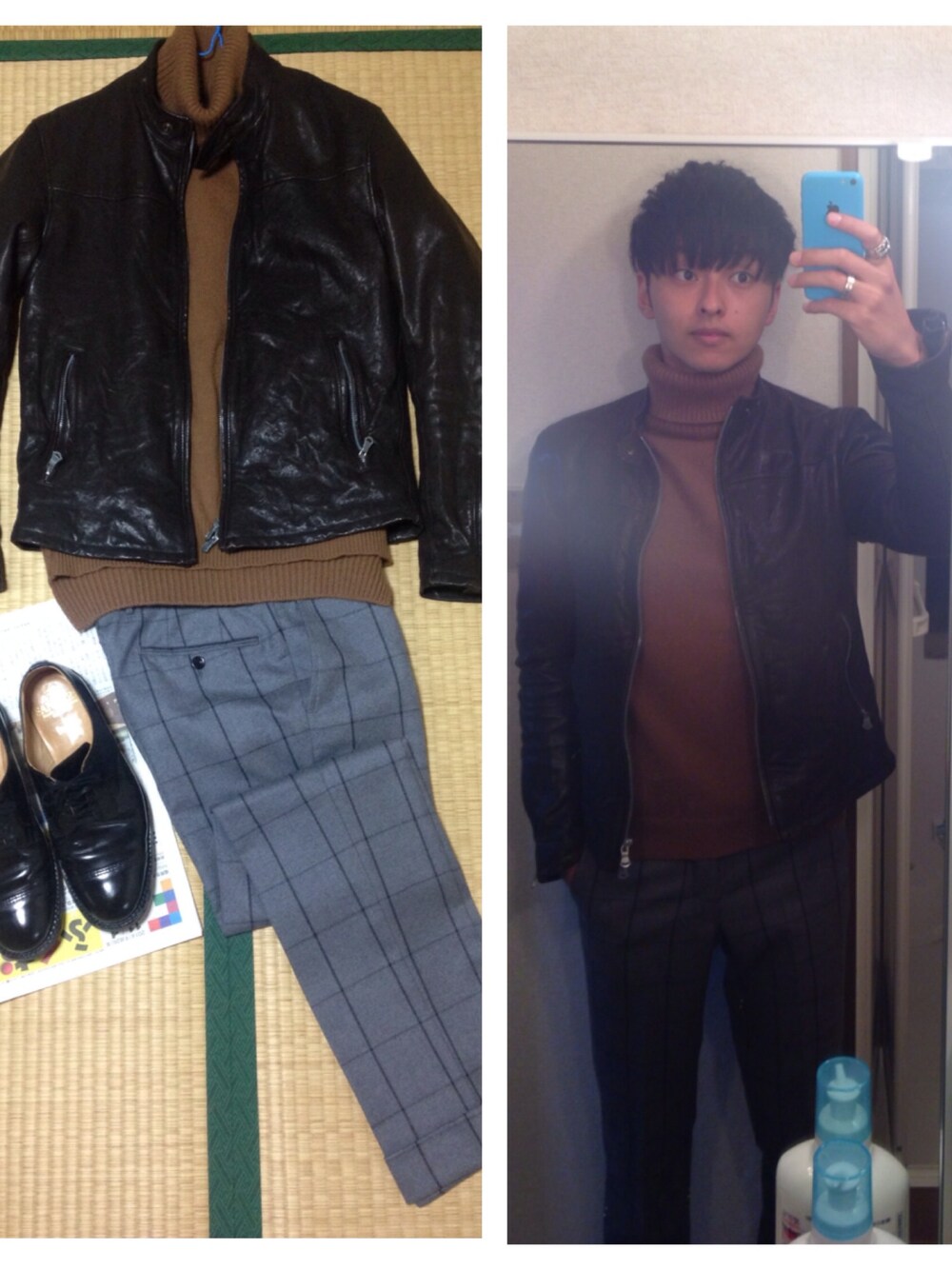 久しぶりの更新!! ライダースを少し綺麗目に来てみました! 本当は白のニットにグレー無地スラックス、スタンスミスとかが今年っぽいんだろうけど、あえて重めの色合いで大人な感じにしてみました^ ^