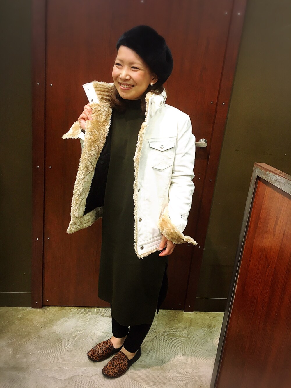 こんばんは◡̈♥︎ 今日は、風が吹いてて昨日同様に寒かったです☃️ 風邪などには気をつけてくださいね⠒̫⃝ そんな寒い日に、白アウターと、カーキのニットワンピースで合わせました🍷 豹柄のスリッポンを履いて、今年のトレンドを取り入れちゃいます🐆 そして、中のボアがゴージャス感を出してくれました✨✨嬉しくってつい、中を見せびらかしたくなりました♡ この時期の白のアウターって清楚なイメージがあるのは私だけでしょうか(//∇//) 今日は、清楚なイメージです♩