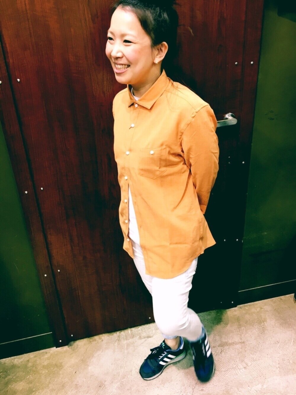 こんばんは〜😘 いつもイイね♡フォロー✨SAVE👆とたくさんありがとうございます🙏❤️ 今日は、風が冷たかったですね😲 あ、岡山の話です✨みなさんとこは、どうだったですか〜⁉️ そんな今日のコーディネートです😁 またまたお団子です笑今日は、急いで団子にしたので、昨日より大きめ🍡日に日に増していくでしょう😎 このオレンジ色のシャツ👚キレイじゃないですか〜✨新作のシャツをさっそく着てみましたよ❤️ しかも、LLサイズで、袖ぴったり✨メンズの七分袖、五分袖は、私にはヒャホーい🙌な長さなんですよね😅腕短いんです笑 まだ春は来そうにないですが、シャツの色だけでも春感漂わせたいな〜😘て思う今日のコーディネートでした😍