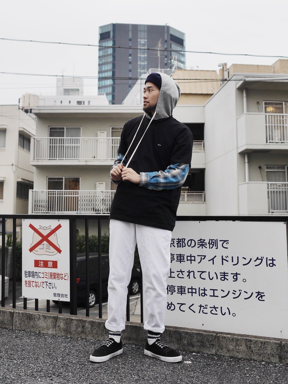 ブラック系のTシャツ/カットソー、ブルー系のシャツ/ブラウスを着用したメンズの春コーディネートの1枚目の写真
