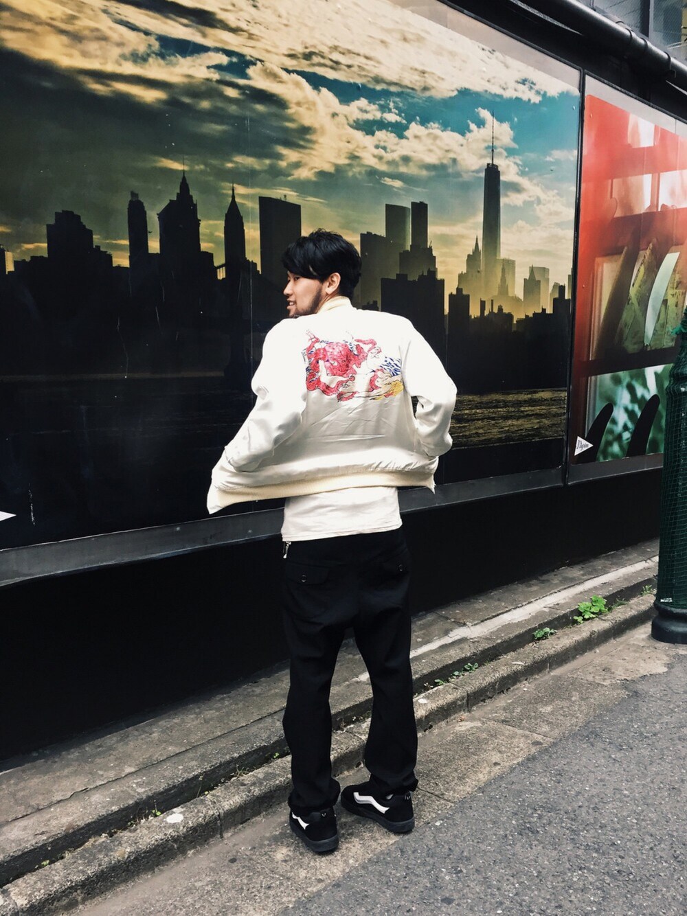 ブラック系のその他パンツ、ブラック系のスニーカー、ホワイト系のブルゾンを着用したメンズの春コーディネートの1枚目の写真
