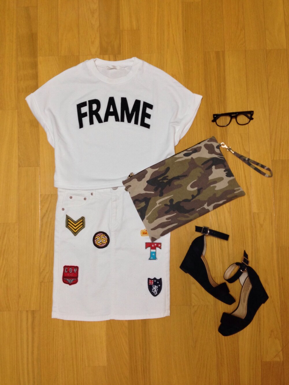 スカート_しまむら サンダル_Adam et Rope' メガネ_urban research doors ワッペンいっぱいついたスカート 980円! 安いーーっ(੭ु ›ω‹ )੭ु⁾⁾♡