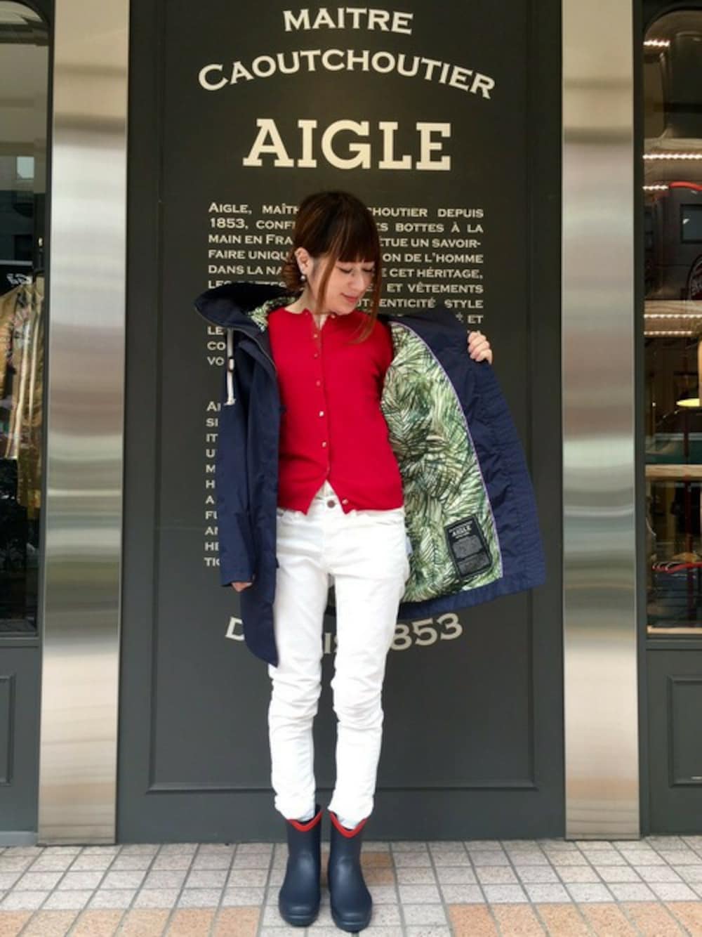 防水のミリタリーコートの裏地がオシャレなヤシの葉柄。雨の日のコーディネートが楽しくなりますように。