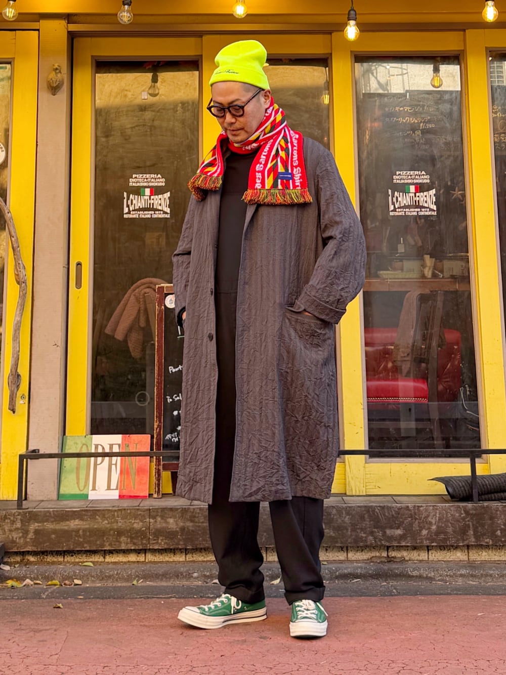 This scarf is my favorite this season! シンプルなモノトーンコーデにキャップ、マフラー、シューズで差し色を追加するだけで楽しくなる🙆♂️