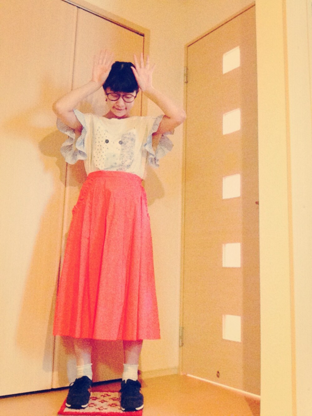 『寝ていいよ』と言われたら速攻寝れそうなぱげです(e_e) 今日のぱげコデ☆ ネイビーのニューバランスと赤のスカートで秋色コデです♡