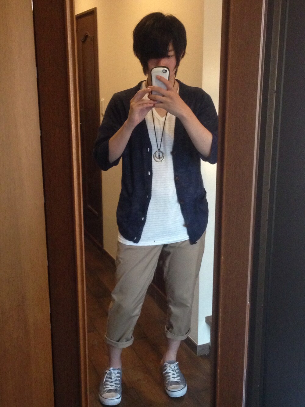 青のカーディガンに茶色のパンツ合わせてスッキリめにしました! こういう格好だとアクセサリ結構重要ですよね( ‾ ∇ ‾ )