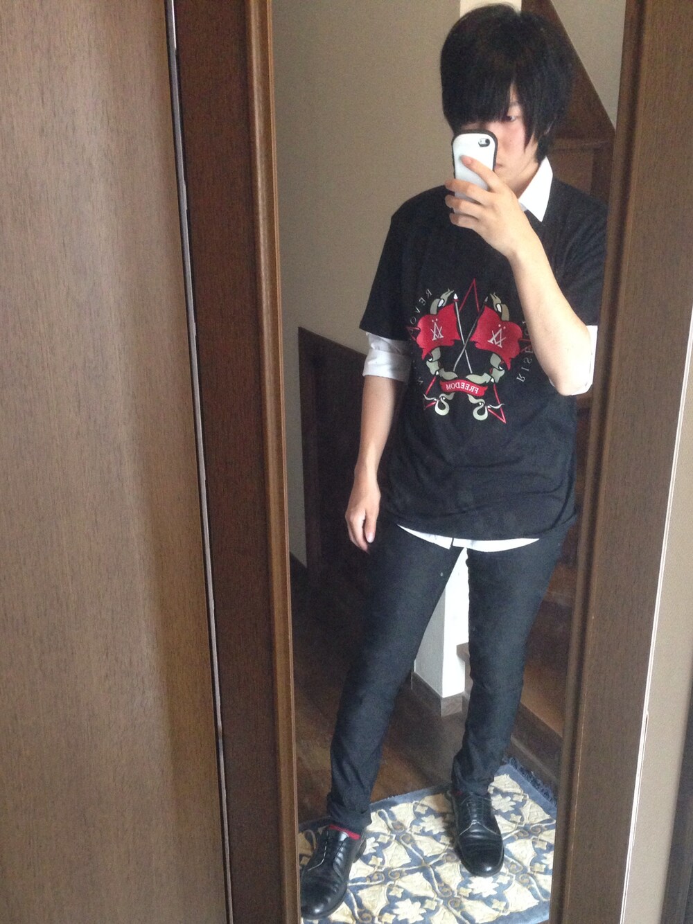 バンドT第四弾! そろそろ飽きてきましたかね?(笑)💦 もっと持ってますが(笑) バンドTはthe HiATUSです( ‾ ∇ ‾ ) クロのTシャツだったので下にワイシャツ着てみました! 黒パン好きなんで今回も黒スキニー(笑) Tシャツに赤入ってるので靴下もそれとなく赤が…よくわかんないですね、この写真(^^;;すいませんww