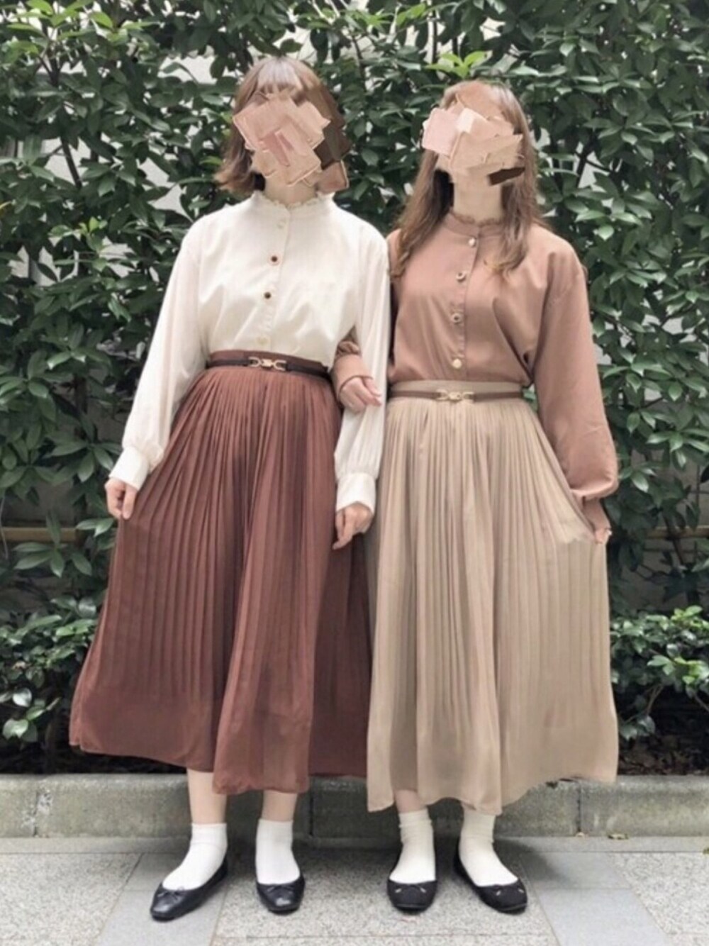 ヴィンテージライクなボタンがポイントの イロイロボタンブラウスと シフォン素材でエアリーな雰囲気の シフォンプリーツロングスカート❣️ 【モデル身長】左:165cm 右:158cm