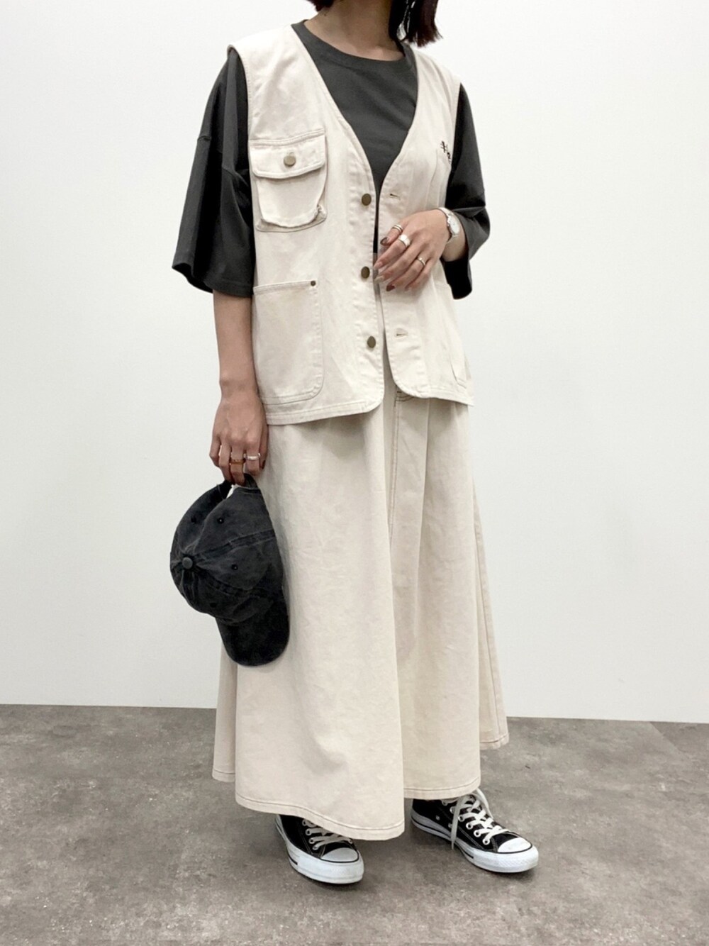 ワークベスト×シェフスカートの セットアップコーデ✨ アイボリー×スミクロが可愛い👌🏻