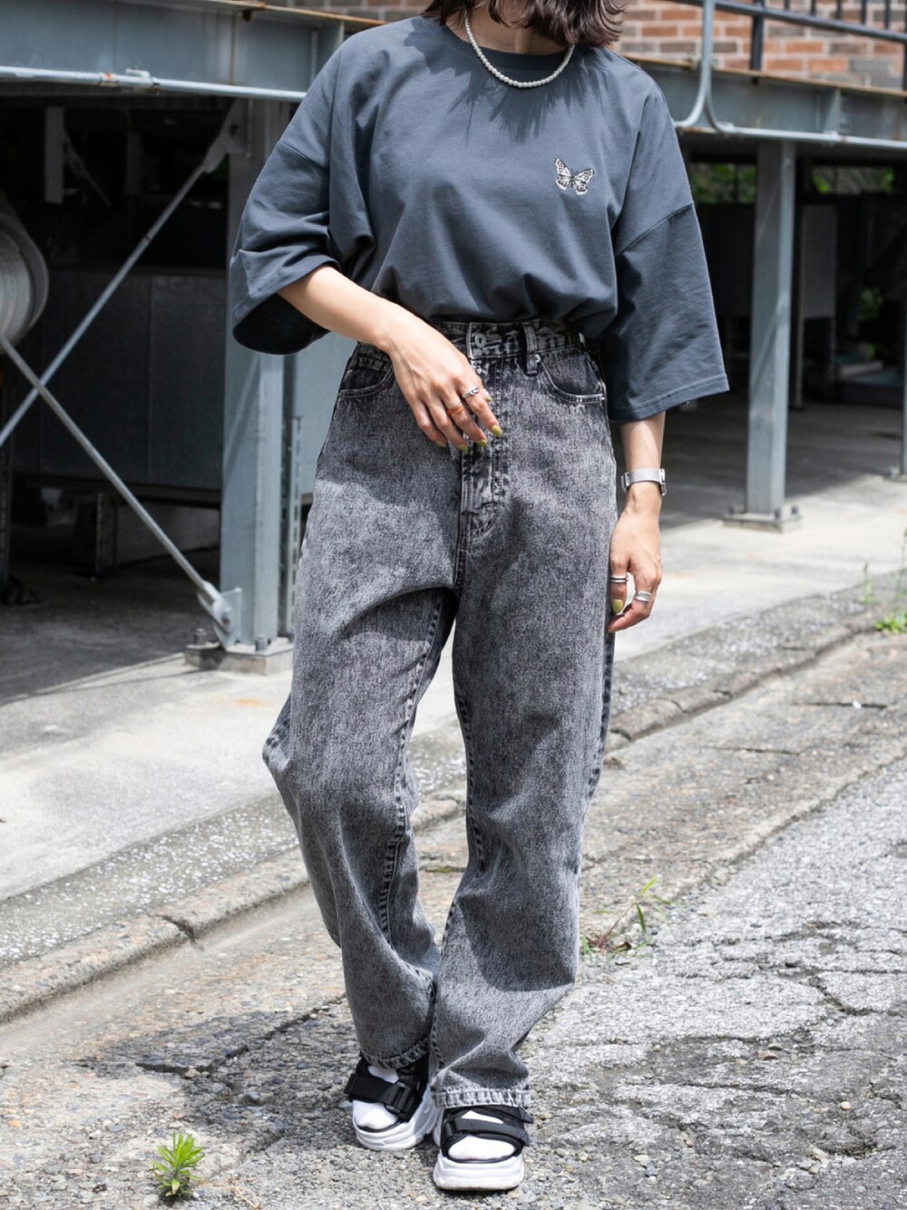 蝶々の刺繍が可愛いプリントTで メンズライクコーデ💙 パールのネックレスがアクセント👌🏻