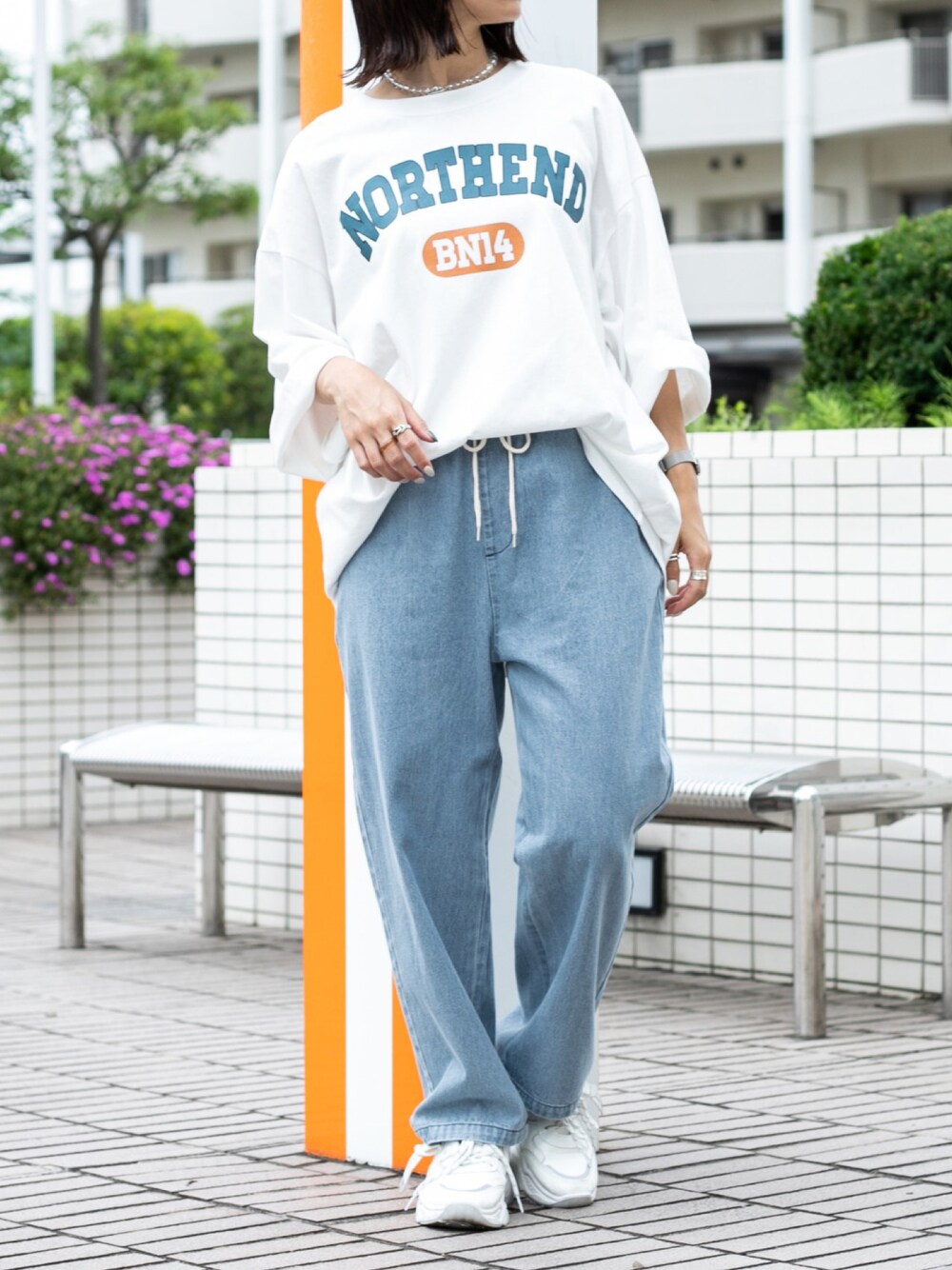 夏の爽やかコーデ⛱ デニム見えイージーパンツは 楽ちんな履き心地でこの夏大活躍すること間違いなし!