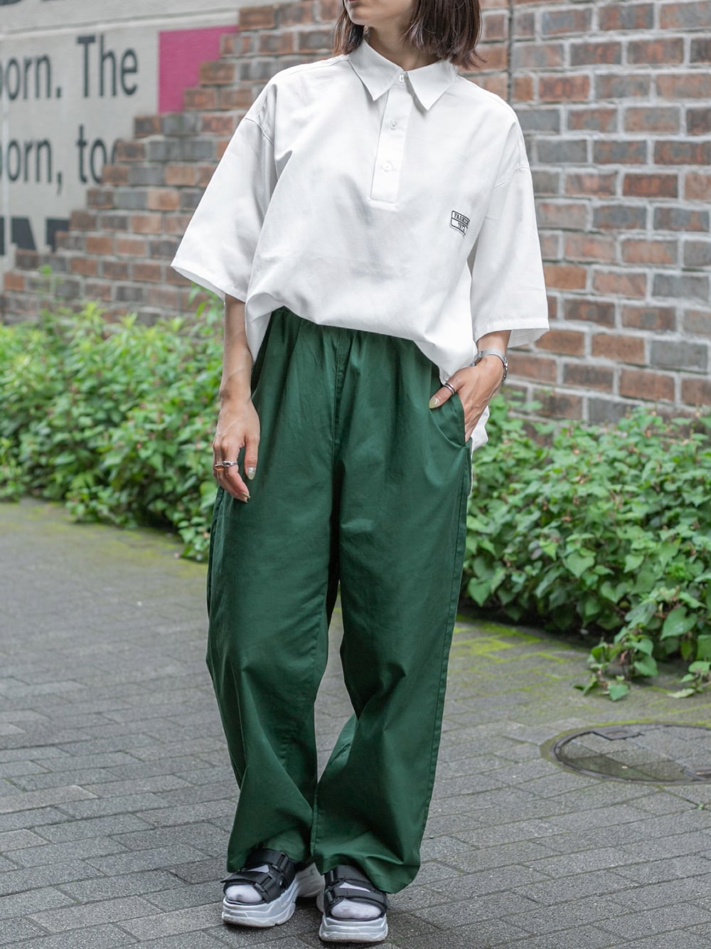 トレンドのカラーイージーパンツとオックスシャツの綺麗めカジュアル💚