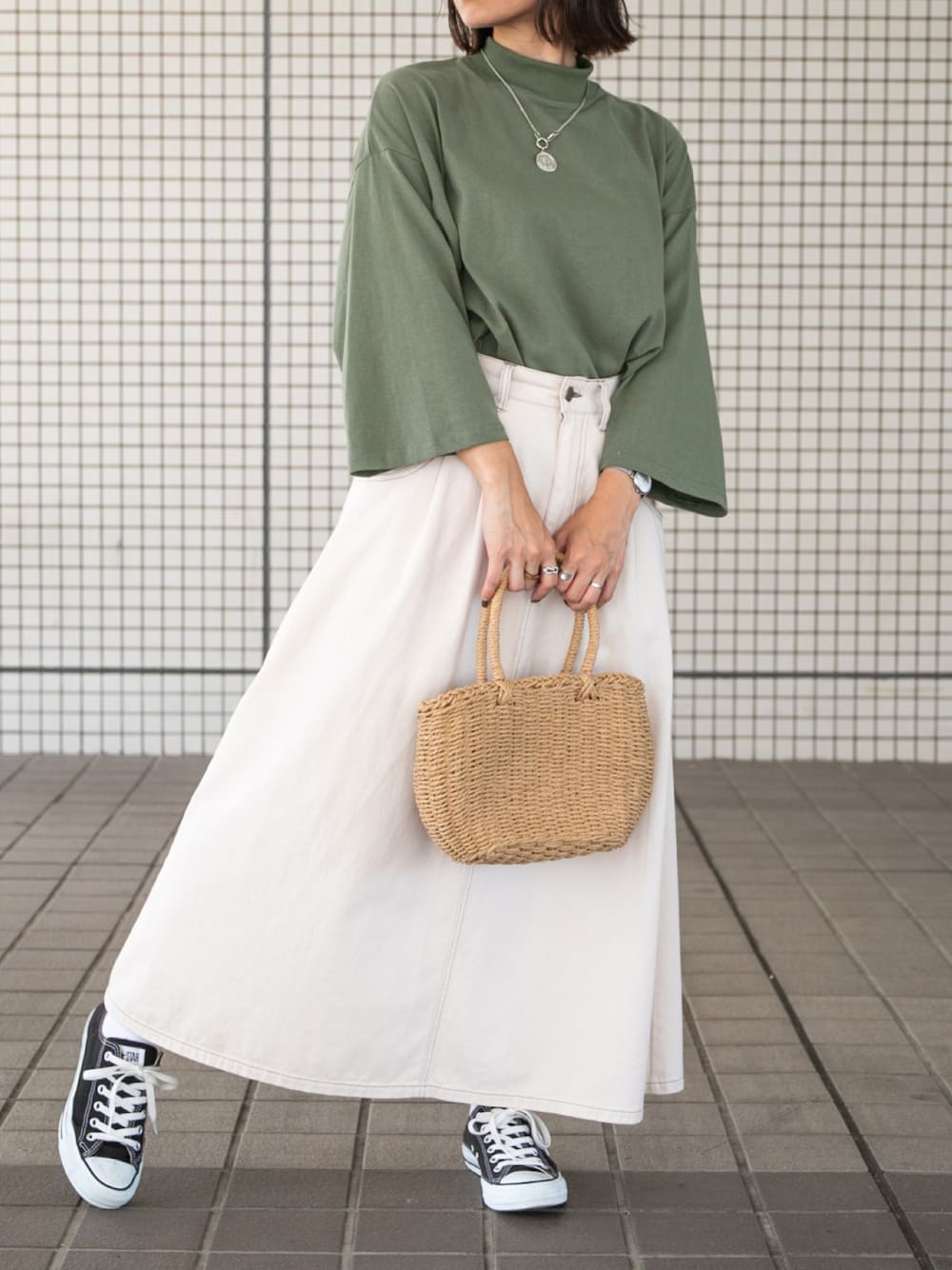 グリーン×ホワイトで爽やかコーデ💚🤍 カゴバッグが夏感を演出🌻