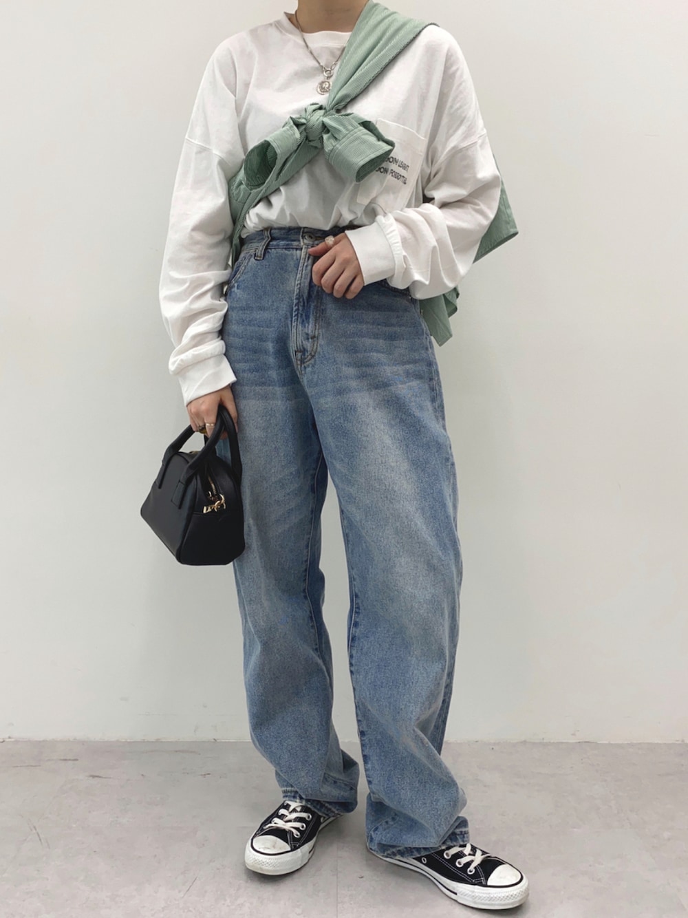 グリーンのシャツが差し色に🍀 たすき掛けコーデ