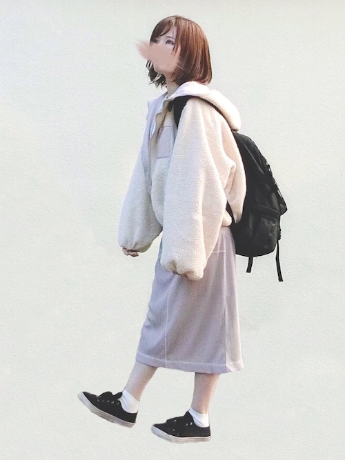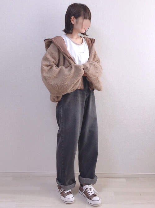 フード付きボアブルゾンを使用したコーデ✨ モカ、ベージュ、ライトベージュの3色展開🙌🏻 たっぷりとしたボリューム袖がポイント❣️