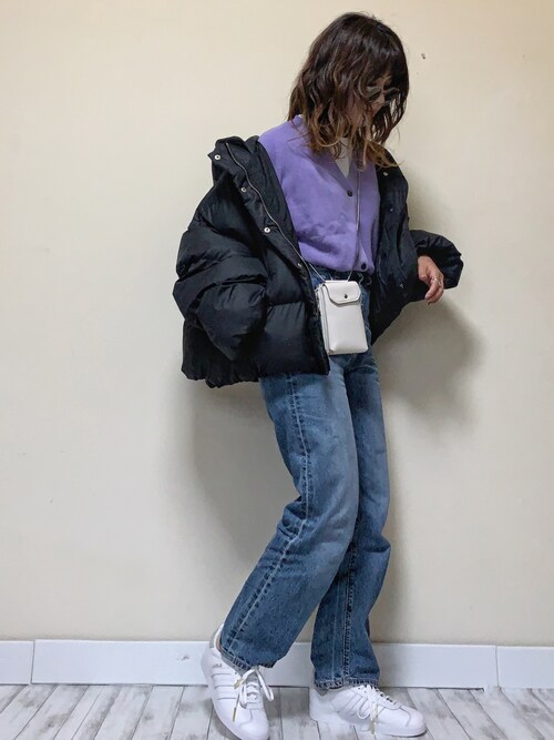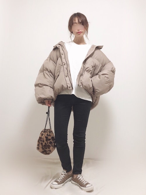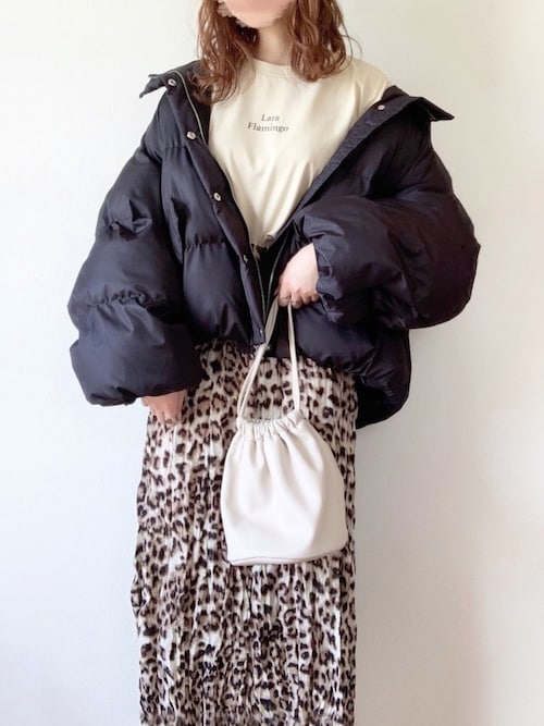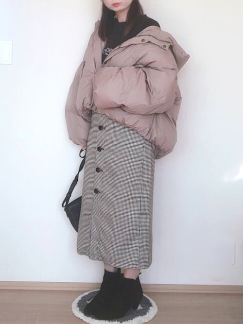中綿ブルゾンを使用したコーデ🐑💕 定番のブラックはもちろん、 ラテカラーでフェミニンさをプラス👌🏻 ショート丈なのでボトムを選ばない💭