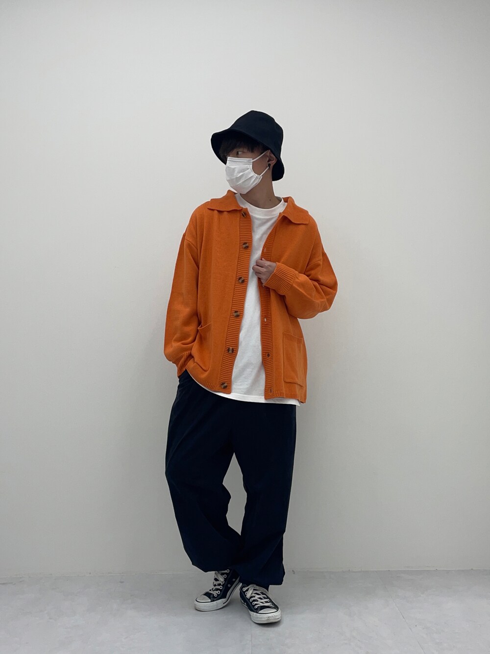 オレンジ系のカーディガン/ボレロを着用したメンズの冬コーディネートの2枚目の写真