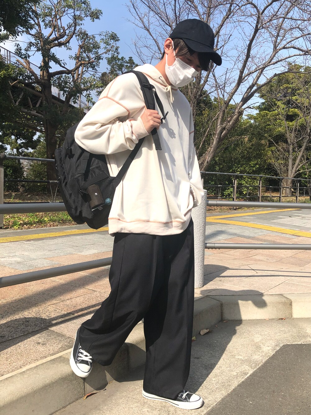 ご覧くださりありがとうございます‼️ 配色ステッチフーディーとストレートワイドパンツを使ったコーデです❗️
