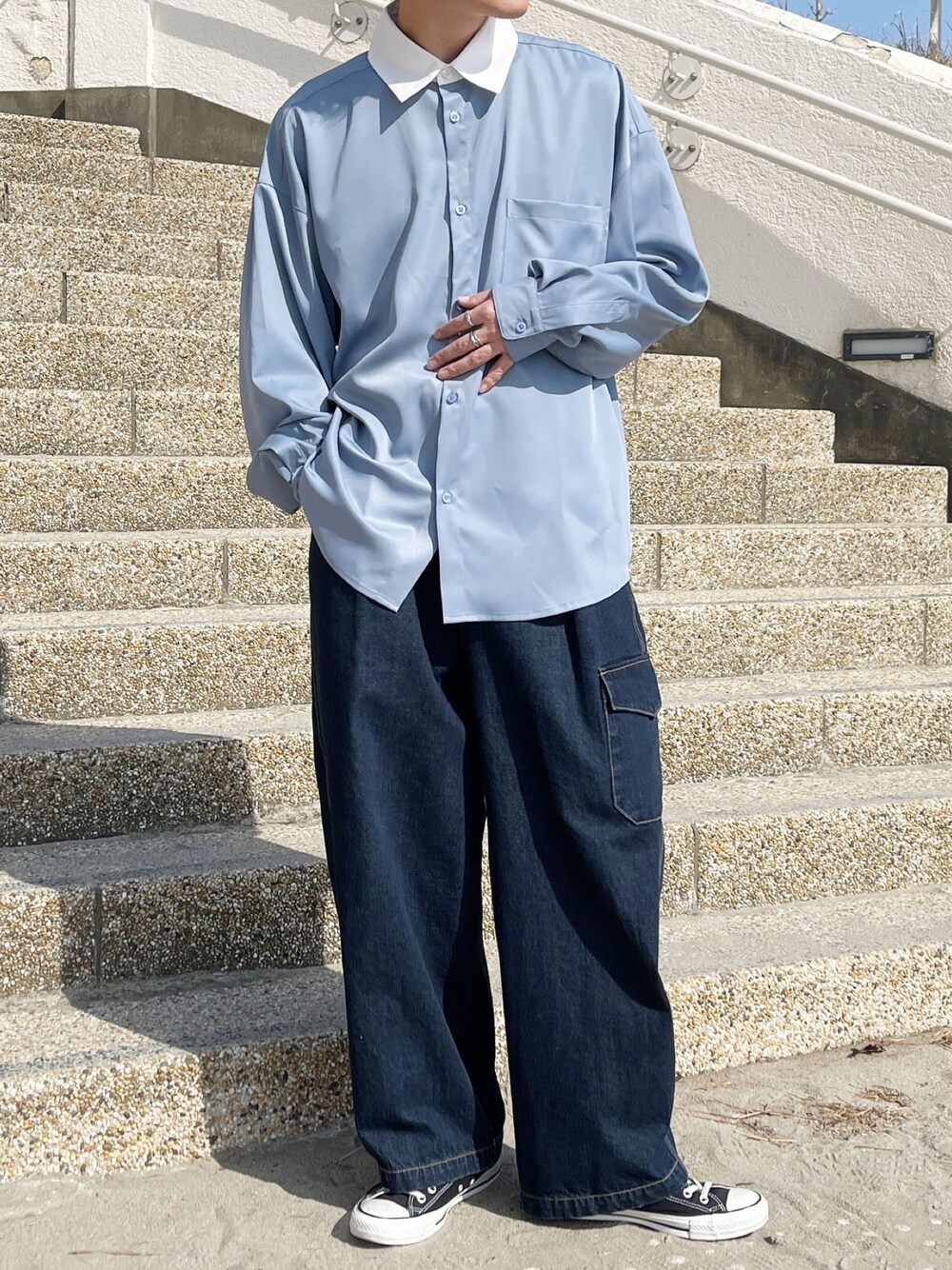 ブルー系のシャツ/ブラウスを着用したメンズの春コーディネートの1枚目の写真
